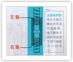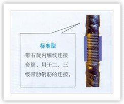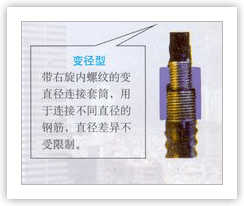 直螺紋套筒三大系列及連接示意圖:標準型(正常情況下的鋼筋連接),正反絲扣型(用于兩端鋼筋均不能轉(zhuǎn)動的場合), 異徑型(用于不同直徑的鋼筋連接)